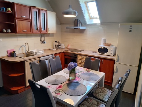 - Jól felszerelt amerikai konyha étkezővel, amelyben van mosogatógép, hűtő, fagyasztó, mikro, kávéfőző, gáztűzhely, elektromos sütő, kenyérpirító, vízforraló.
